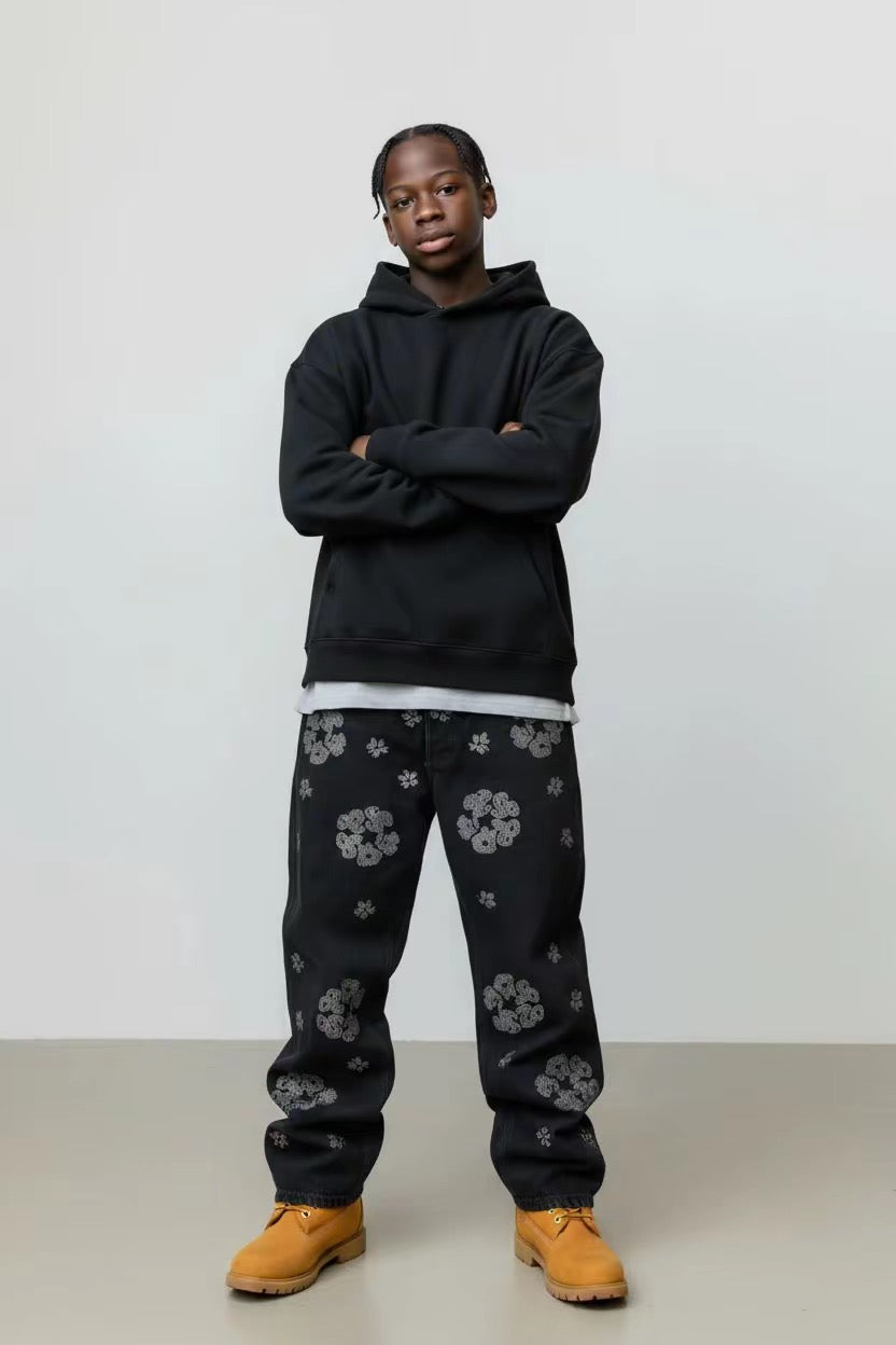 Un look che unisce comfort e personalità : felpa nera basic, pantaloni baggy con pattern floreale Diamomd . Una combinazione semplice ma d’impatto, perfetta per chi vuole muoversi con stile senza rinunciare alla comodità .