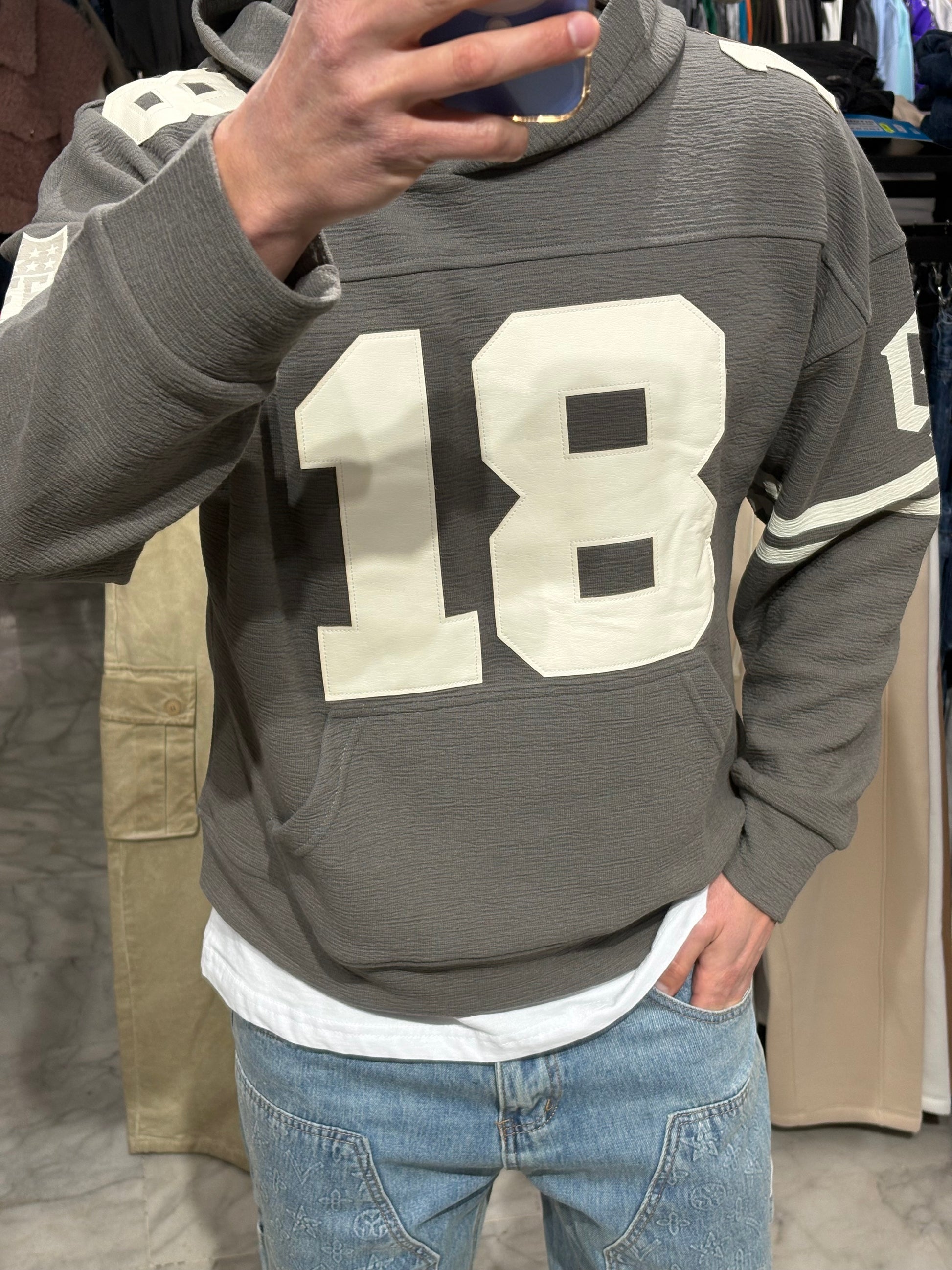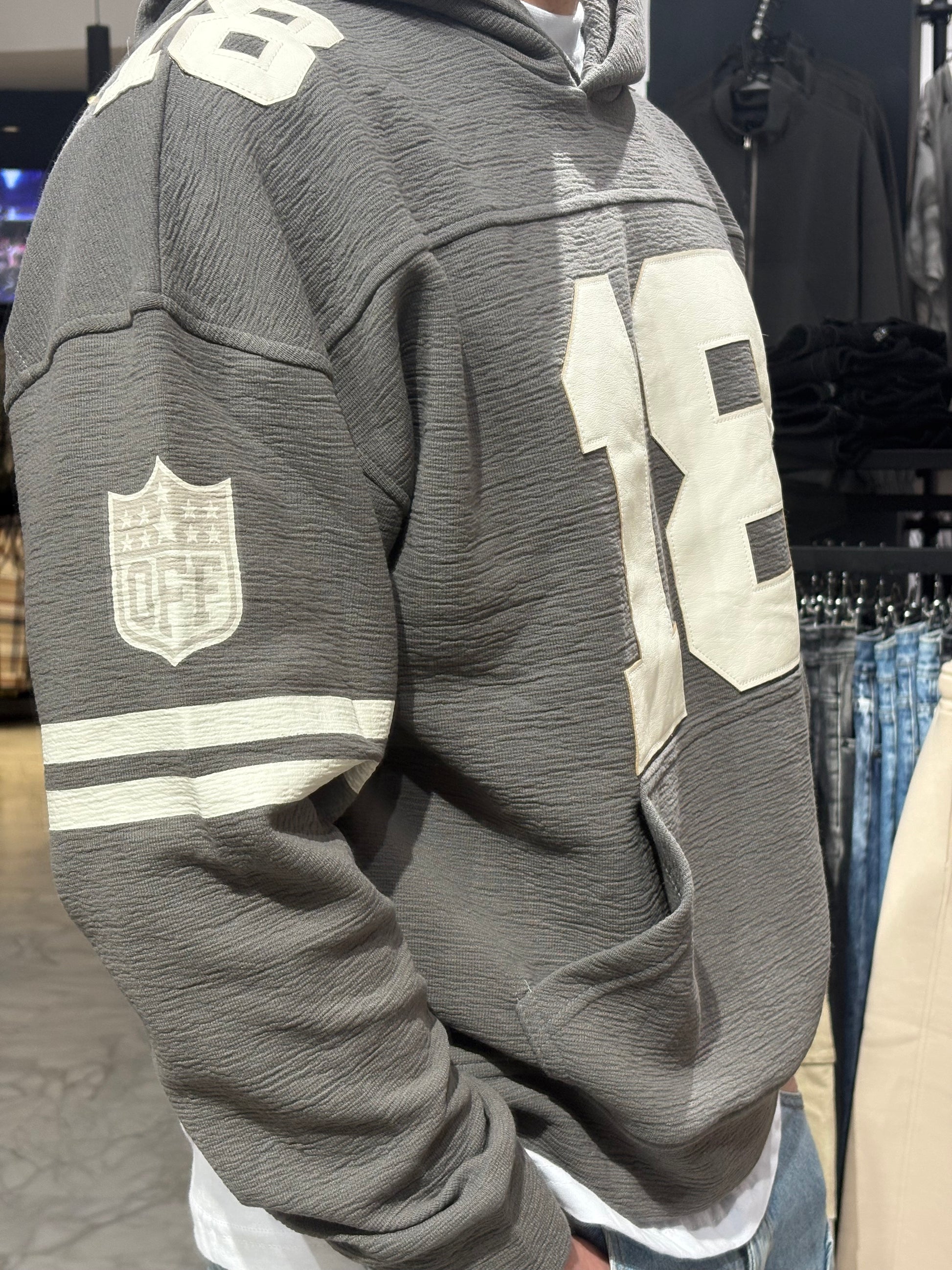 Questa felpa ha una texture particolare, quasi "crinkle" o a nido d'ape, che la rende molto più ricercata di una normale felpa di cotone. Richiama lo stile delle maglie da football americano vintage, ma con un tocco luxury.
