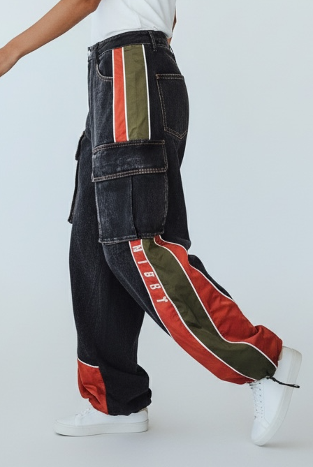 Jeans arricchito da scritte, tasche, e strisce colorate, quando il Denim si abbina ai colori puoi solo che sbizzarrirti nell’abbinamento!